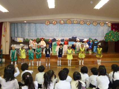発表会の予行練習では、本番さながらに衣装を付けて、歌や踊りをしました。可愛い衣装とかぶり物に気分は、最高です。子供たちの演技にも拍車がかかります。21日(土)には、お客様やお父さん、お母さんに見てもらおうとはりきっています。