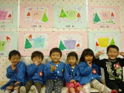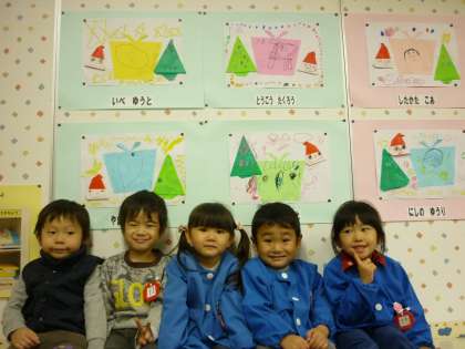 今日は、折り紙でサンタクロースとクリスマスツリーを折って、ほしいプレゼントの絵を描きました。「先生、これねレゴブロックのおもちゃだよ」「サンタさんお願い、お手紙見に来てね」と、作品を見ながら友達と話していました。