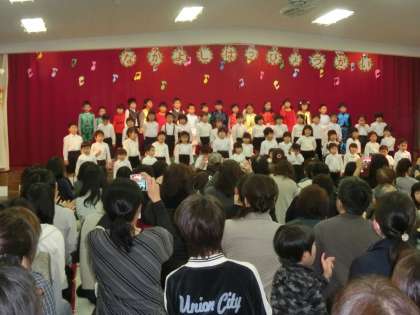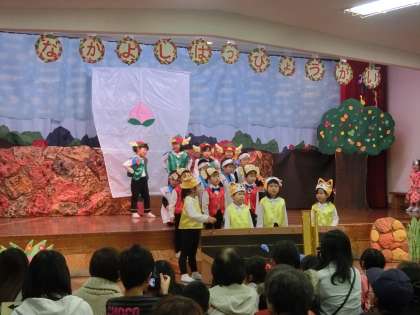 3歳児は「かえるののどじまん」4歳児は「ももたろうの冒険」5歳児は「ねずみのよめいり」の劇遊びをしました。それぞれの役になりきって元気いっぱいに歌ったり踊ったり言葉を言ったりしました。大勢のお客様に拍手をもらい嬉しかった子供たちです。