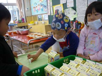 お家の方に準備していただいたエプロンをつけ、テーブルを拭いたり、「みなさん、給食の準備できましたか」と言葉を言ったり、牛乳やストロー、パンなどをお盆の上に置いたりする仕事をしています。