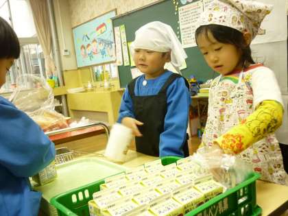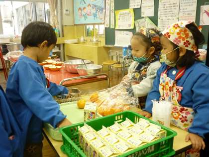 10月の終わりから給食当番を始めています。子供たちは、いつ給食当番をするのかをとても楽しみにしています。