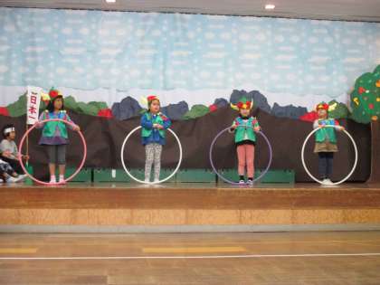 そのあとのお楽しみコーナーでは、ミニミニ発表会をしました。子供たちはなかよし発表会が終わってからも、「劇遊び楽しかったな」「またしようよ」と劇遊びをして楽しんできました。今日は、好きな役を選んで、さらに他の年齢の劇にも参加して、劇遊びを楽しみました。他のクラスの劇も見ていた子供たちは、どの子も役になりきってセリフや動きを上手に真似していました。将来は役者になる子が出てくるかな!?