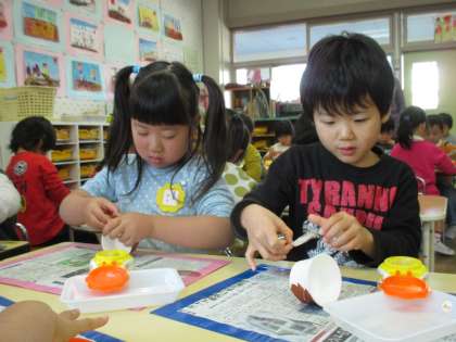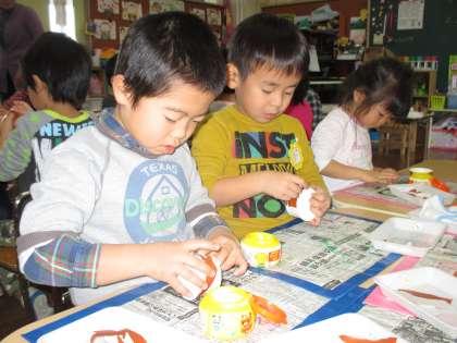 クリスマスに向けて、ツリーの製作に取り組んでいます。今日はレンガの部分になるゼリーカップに茶色の折り紙をちぎり、のり付けして貼りました。折り紙でサンタクロ−スづくりにも挑戦!秋の遠足で拾ったドングリや飾りをつけて、素敵なツリーに仕上げていきたいと思います。「早く飾りをつけたい!」と子供たちは楽しみにしています。