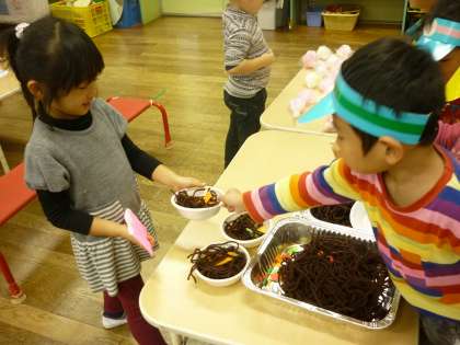 「いらっしゃいませ」「焼きそばどうですか」と、大きな声でお客さんを呼んだり「これください」と買い物をしたいりして、言葉のやり取りを楽しみながらお店屋さんごっこを楽しみにました。遊びに必要なものを作りながら、いろいろな役になって遊んでいきたいと思います。