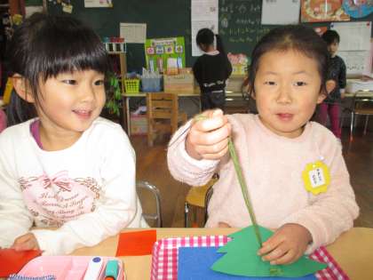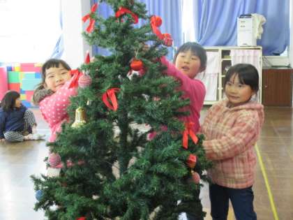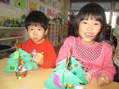 年中組は、モミの木の形に切った画用紙を、毛糸で縫って立体的なクリスマスツリーを作っています。「キラキラつけたいな」「サンタクロースも飾ろうよ」など話をしながら楽しそうに作っています。年長組は、クリスマスツリーを飾りながら♪we wish you a Merry Christmas〜♪とクリスマスソングを歌いながら「サンタさんにきてほしいね」「ぼくね、お手紙書いたよ」などなかよし子供会を楽しみにしている子供たちです。