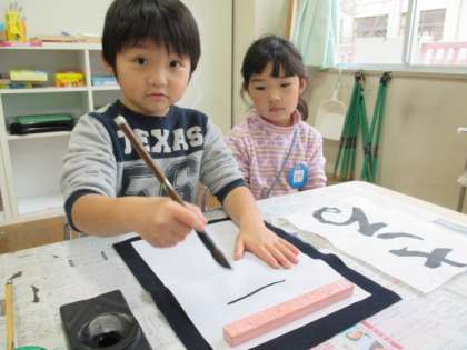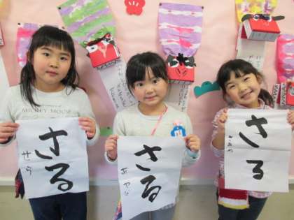 今日から3学期が始まりました。「あけましておめでとうございます」と元気に挨拶を交わすと久しぶりに会う友達と「あのね…」と休みの間に経験したことなど話しがとまらない子供たちでした。年長さんは、かきぞめで今年の干支の「さる」を伸び伸びと書いていました。