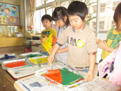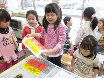 スチレンの板に好きな絵を描いて版画にしました。いつもと違う素材でしたが、油性マジックや粘土のヘラなどで線や点を描くことがおもしろかったようです。「電車を描こうかな」「私は、虹の絵にしたいの」と思い思いの絵を描いていました。