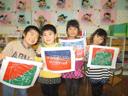 インクをつけて,和紙をのせてバレンでこすると絵が映って「わぁーっ」と驚いた様子で、出来上がった自分の作品を見ていました。何枚も映るおもしろさや描いた線が浮かび上がってくる不思議さなど感じてほしいと思っています。