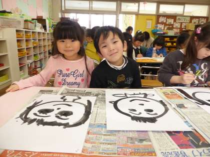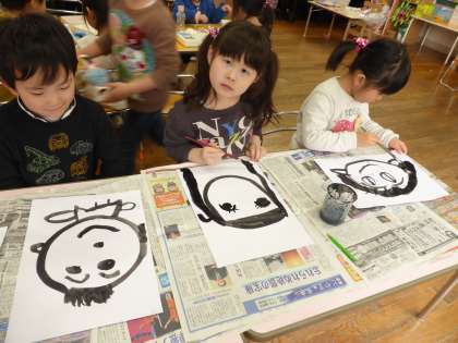 「自分の顔を描こう!」と筆を使って描きました。「こんな目になったよ」「かっこいい顔になったかな」などと話しながら伸び伸びと描いている子供たちでした。