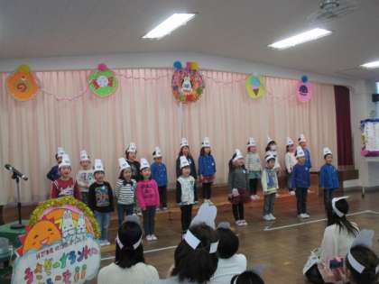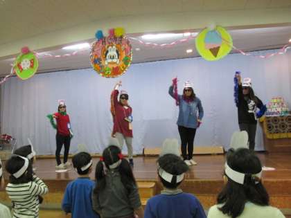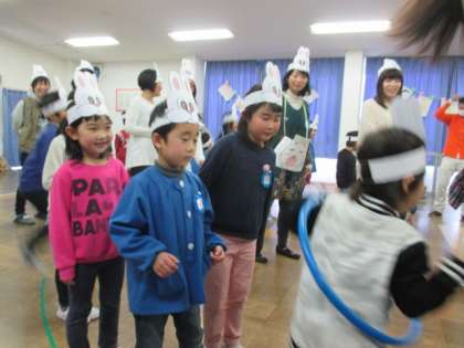 うさぎのおめんをかぶった子供たちは、お家の人と一緒にクイズやじゃんけん大会、フラフープくぐりゲーム、ボール渡しゲームなどなど・・・たくさんのゲームをして遊びました。子供たちは「じゃんけん5回も勝ったよ!」「クイズ難しかった〜」と楽しんでいました。