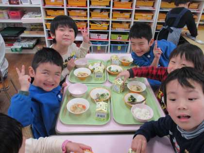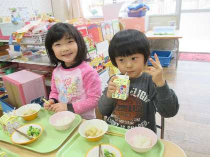 給食の時間が近づくと「早く行きたいなぁ。うさぎさんのお部屋に!」「私は、たんぽぽ組だよ」と話しながら楽しみにしていました。