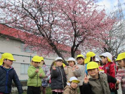 歩いて行くと「ピンクの花がいっぱい!」「近くまで行ってみよう」と満開の早咲きの桜の樹を見つけました。「あ!たんぽぽも咲いている」と驚きの声が聞こえました。