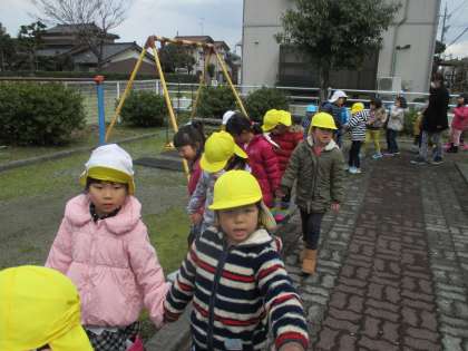 風はまだ冷たいけど、お日様がさしてきました。年長さんとお散歩に出かけるのも今日が最後です。桜のつぼみも少し膨らんできて、公園にはつくしも顔を出していました。