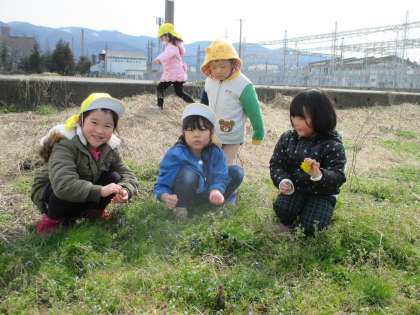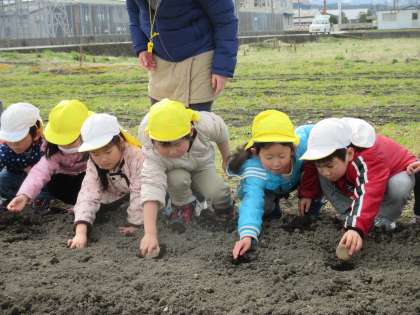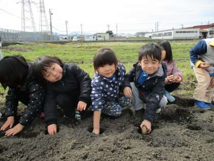 年少と年中組が学校農園に行って、ジャガイモの種イモを植えてきました。半分に切ったジャガイモの切り口を下にして、土の中に入れ、そーっと土のお布団をかけてあげました。そしてみんなで「大きくなーあれ」とおまじないをかけました。その後、畑の中で虫を探したり花を摘んだりして、ぽかぽかお日様のもとでたくさん遊んで帰ってきました。収穫してカレーライスを食べるのを今から楽しみにしている子供たちです。早く大きくなーあれ…
