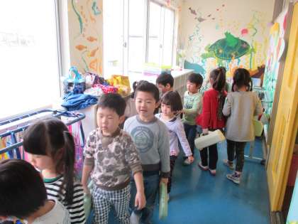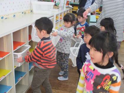 今年度もあと1日となりました。今日はみんなで道具箱などの所持品を新しい部屋に運び、進級の準備をしました。ひとつお兄さんお姉さんになる喜びでいっぱいの子供たち。「4月からはこのお部屋だよ。嬉しいね」と言うと「うん!」と満面の笑みで答えていました。