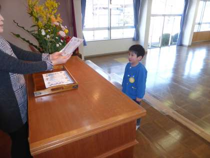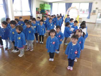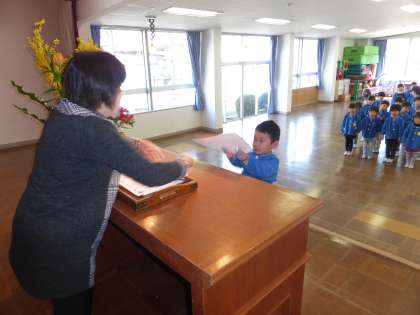 今日は、3・4歳児の修了式をしました。一人一人、園長先生から証書をいただき、とても嬉しそうに友達と証書を見せ合っていました。