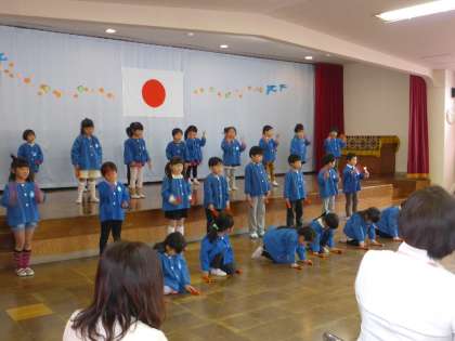 入園式後の歓迎会では、年中児がかわいい手遊び、年長児がかっこいいよさこいを披露すると、楽しそうに見ていました。