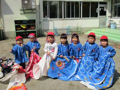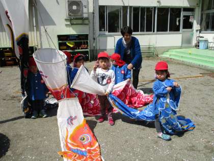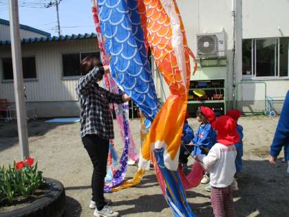 遅咲きの桜の花が少し残る園庭に、子供たちが、こいのぼりをあげました。大きな大きなこいのぼりをみんなで、よいしょと持って、「元気に、泳いでね」と見上げながら、綱をひっぱりました。