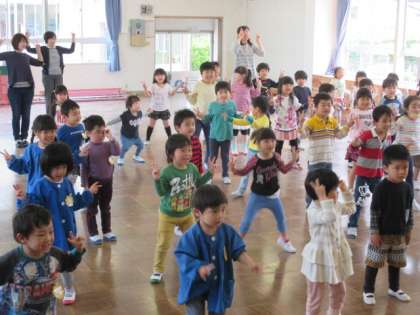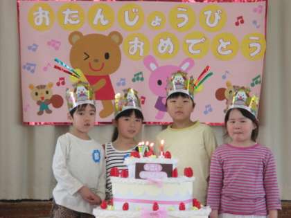 今日は今年度初めてのお誕生会。みんなで4月生まれのお友達のお祝いをしました。誕生児の子供たちは、自分の名前や大きくなったら何になりたいかや、みんなの質問に、ちょっぴり照れながらも大きな声で答えていました。おうちの方のメッセージを聞くと満面の笑みになり、とても嬉しそうな子供たちでした。そのあと、みんなで「サンサン体操」や「エビカニクス」を元気に踊って楽しく過ごしました。