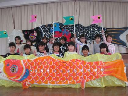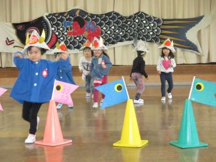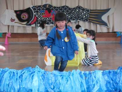 今日は、子供の日の集いをしました。園長先生から、頑張る心・ありがとうの心・優しい心・元気な体と心をもって金太郎のような強くてやさしい子供になってほしと話を聞きました。その後、こいのぼりの歌を歌ったり、こいのぼりのトンネルをくぐってかけっこをしたり、こいのぼりリレーをしたりして楽しみました。