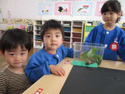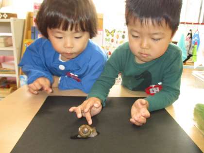 雨の日にカタツムリを見つけて保育室で飼育が始まりました。「カタツムリ、ウンチしてるよ」「ほんとだ」とウンチに気付いたり「♪デンデンムシムシ〜」と歌いだしたりしてみんなで見ています。飼育ケースから出すと、のっそりと動き出す様子や角が出てくるのを見たりして「触ってみたい!」とそーっと角を触って「あ!隠れたよ」と一人が言うと「触ってみたい」と指でツンツンしたり・・・・・