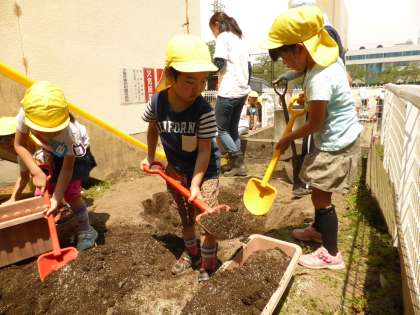 花壇の土をふかふかに混ぜたり、プランターに土を入れたりして、お花を植える準備をしました。もうすぐ、花の苗が届きます。お家の人と一緒に苗植えができるように、土を入れて前庭にプランターを並べました。「どんなお花を植えるの」「バラかな?」「ひまわり?」「きれいに咲くかな」と楽しみにしながら、重たいプランターをみんなで運んでくれました。