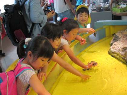 今日は親子遠足に行ってきました。梅かまへ行って、かまぼこ体操を教えてもらったり、作っているところ見たりしてきました。その後、魚津水族館へ行って、サメやエイ、タイなどの色々な魚を見てきました。「お魚大きいね」「お魚ショー楽しかった」と、お家の方や友達と一緒に話をしながら見ていました。