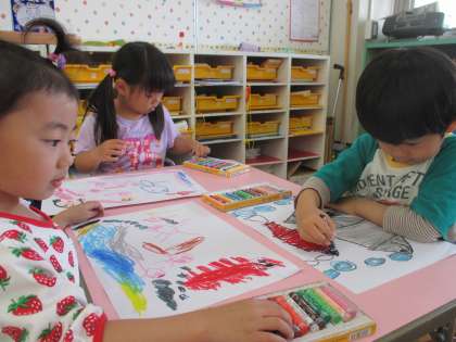 魚やアスレチックの色・形を上手に捉えて、のびのびと絵を描いて、楽しんでいました。