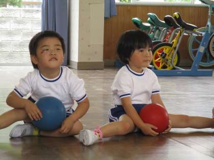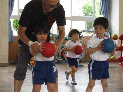 体操教室で、ボールを使って遊びました。片手で持って走ったり床に転がしたりしてボールに慣れていきました。「ついて取る!」「投げて取る!」と少しづつ難度があがってくると「ボールまてまて」と追いかけていましたが、体操教室の先生の指導で少しづつボールが手の中に入ってくるようになってきました。