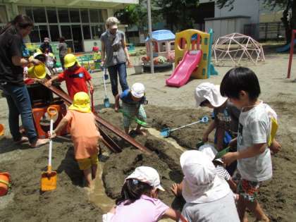 今日は、園庭と遊戯室の好きな場所で遊びました。遊戯室では、一輪車に挑戦す姿を見てもらったり、手をもってもらいバランスを保ちながら乗る練習を手伝ってもらったりしました。園庭では、雨どいをつなげて水を流し、池を作ったりダムなどを一緒に作ったりしました。