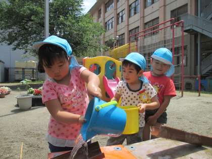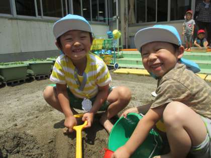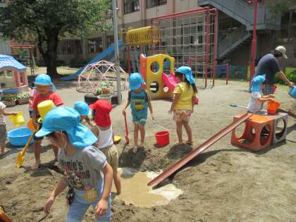 砂遊びや水遊びが気持ちの良い季節となりました。夏に向けて、たくさん水遊びをしていきたいと思います。