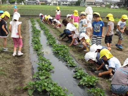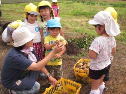 3月に植えたジャガイモが掘り頃となりました。今日はみんなで学校農園にジャガイモ掘りに出かけました。「ジャガイモたくさん掘れるかな」「大きいのあるかな」と楽しみにしていた子供たち。土の中からゴロゴロとジャガイモが出てくると、「先生見てーすごい大きいー!」「赤ちゃんみたいにちっちゃいの出てきた!」と歓声をあげながら、土を一生懸命掘り起こし、たくさんのジャガイモを収穫することができました。サツマイモの葉っぱも大きくなり、みんなで草むしりもしてきました。ジャガイモは7月1日のカレーパーティーに使い、みんなでおいしくいただきたいと思います。「早くカレー食べた〜い!」と今から心待ちにしている子供たちです。