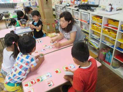 4歳児ひまわり組にママ先生が来られて、一緒に遊びました。お天気は雨でしたが、お部屋の中で輪投げをしたりカード遊びをしたり動物や虫を廃材で作ったりして、楽しみました。