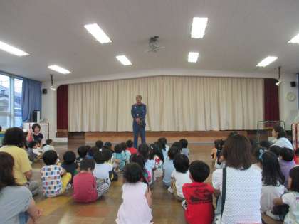 避難訓練では、大沢野消防署の方々が訓練の様子を見に来られました。ハンカチがないときは、服で口を押さえることや、花火はお家の人と一緒にすることなど、火事になったとき、そして火事にならないための約束をしました。