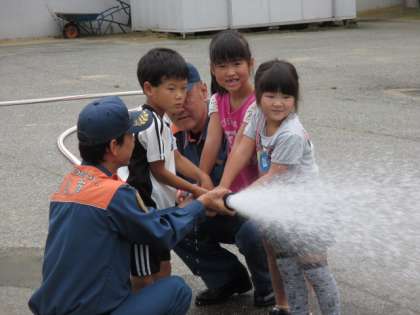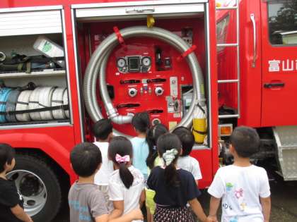 今日は、防火・防災教室がありました。花火をする時は、大人の人と一緒にすることや火遊びをしないこと、日常生活に必要な火の大切さと恐ろしさを教えてもらいました。その後、消防車を見せてもらったり、ホースや道具を説明を聞いたりしました。年長組の子供たちは、ホースを持って放水体験をしました。なかなか的に放水を当てるのは難しかったですが友達と協力して頑張っていました。