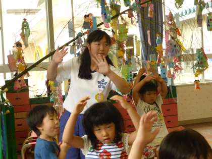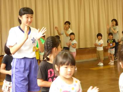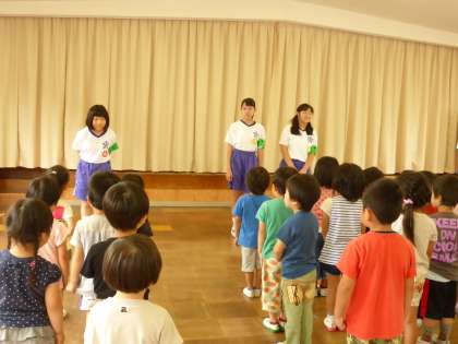 大沢野中学校の2年生が4名、幼稚園に来られました。今日はみんなの前で自己紹介をしてもらいました。子供たちは、大喜びで、「どんなおもちゃが好きですか」「どんな色がすきですか」とお姉さん先生に質問していました。今日は盆踊りを一緒にしたり、折り紙をしたりしました。明日は、晴れたらお庭でたくさん遊びたいねと、楽しみにしています。