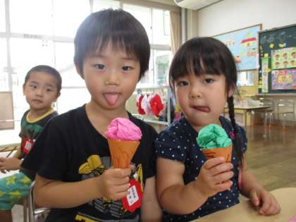 「暑いね」「冷たいもの食べたいね」…「そうだ!アイスクリーム!」と話しながらアイスクリームつくりをしました。画用紙や色ちり紙を準備して作り始めると「あのね、ママと抹茶アイス食べたよ」「イチゴの食べたい」「メロンも」と子供達の楽しい話が聞かれました。