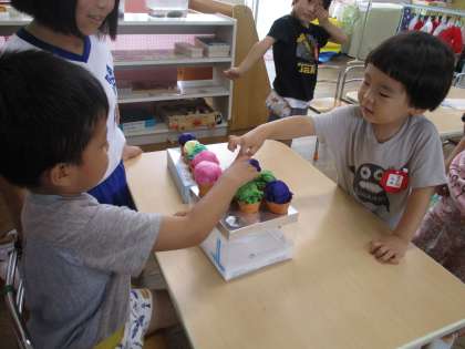 ちり紙を何枚も重ねたり丸めたりギュッギュッと詰めたりしながらとても楽しそうに作っていました。ペロペロおいしそうになめていると「お店屋さんになるよ」とアイスクリーム屋さんごっこになりました。自分たちで作って遊ぶ楽しさも味わった子供たちでした。