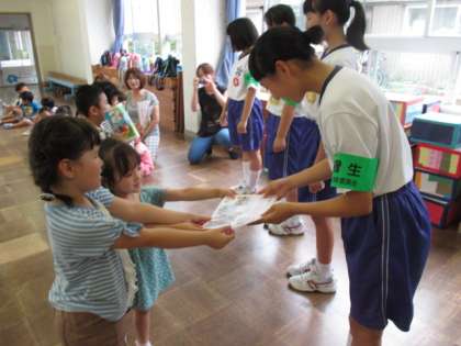 お別れ会では、中学生のピアノに合わせて、一緒にかもつれっしゃをして遊んだり、「一緒に遊んでくれてありがとう」「また遊びにきてね」と、子供たちからプレゼントを渡したりしました。