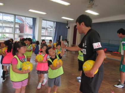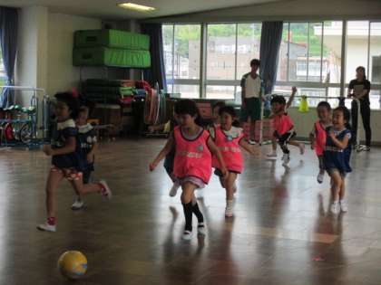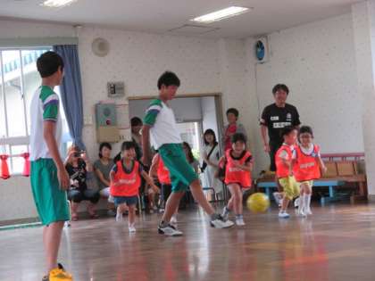 ボールを投げたり受けたり、ドリブルをしたりと、ウォーミングアップでたくさんボールと仲良くなり、その後、みんなで試合をしました。最後に、4人のコーチチーム対子供たちチームで試合をしました。みんなコーチに負けまいと、大張り切り!ボールを一生懸命追いかけ、シュートもたくさん決まり、とても盛り上がりました。コーチや中学生のパスやドリブルも、さすがかっこよかったですよ!いっぱい汗をかいてサッカー大好きになった子供たちです!