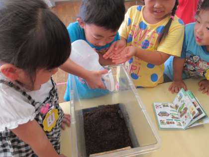 登園してきて飼育ケースを覗くと、「あ、カブトムシいる!」と子供たちは大喜び!みんなで土を替えて、カブトムシを観察しました。