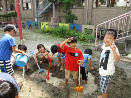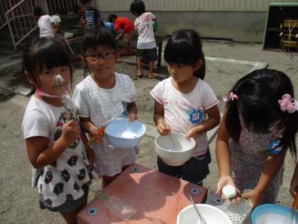 プールに入ったり石鹸の泡作りをしたり、砂場で雨樋に水を通してダムや川をつくるなどして水遊びを楽しみました。
