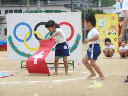今日は、運動会でした。今年のテーマは「ちびっこオリンピック」!オープニングは、年長さんの鼓隊「FLASH」でした。かけっこ、玉入れ、綱引き、親子競技など頑張りましたね。年長さんのリレーは、抜いたり抜かれたり最後まであきらめない気持ちが伝わってきました。たくさんの応援をいただいてありがとうございました。