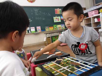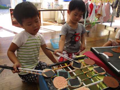厚ボールを丸く切って色々な味のお煎餅ができあがりました。「あのね、僕の好きなのは醤油の味だよ」「海苔のついているのもあるよ」「海老せんべいも食べたいな」と子供たち!!マジックでゴマやエビを描いたらおいしそうな煎餅の出来上がりです。
