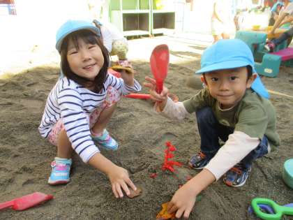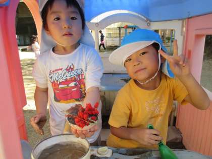 「○○ちゃんのつくったケーキおいしそうだね」「一緒に飾りつけしようよ」「僕はごはんもつくるね」と友達と一緒に話をしながら、気持ちの良い秋晴れの空の下、仲良く遊んでいました。