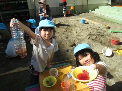 「ジュースも飲みたいね」と、ベコニアの花を摘んで色水ジュースづくりもしました。