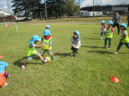 4歳児ひまわり組は、初めてのサッカー教室に、ワクワク!ドキドキ!コーチに教えてもらいながら、友達にぶつからないように走ったり、ドリブルやシュートをしたりして、ボールと触れ合いました。