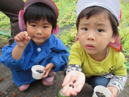 「あのね!この前採ってみたらハートの形だったよ」「え!そうなの」とみんな興味津々!!棚を下してもらってさっそく採りはじめました。「ハート見つけた!」「この種大きいよ」「こんなに沢山採ったよ」と夢中で種取をしていました。