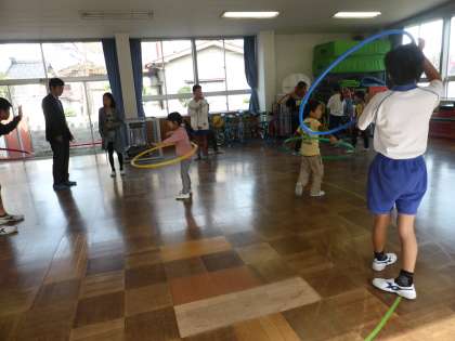 幼小交流学習で、年長児と大沢野小学校5年生のお兄さん、お姉さんが一緒に楽しく交流しました。5年生が考えてくれたグループ活動(輪投げ、うの、ボーリング、貨物列車)を一緒にしながら体を動かしたり、考えたりしている様子がとても可愛かったです。来年は小学校で6年生と1年生。一緒に遊んだり勉強したりできますね。