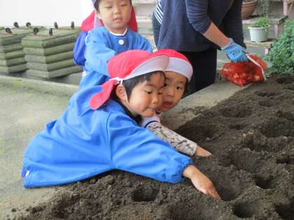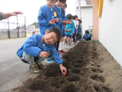 ちゅーりっぷの球根を年中児と年少児が植えました。「頭を上にしてそっとおくよ」と話してから球根を渡すと「こうだね!」と確かめながら掘った穴の中にいれていました。